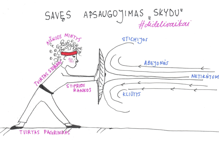 Kas svarbu, kai reikia "atstovėti" savo idėją, mintį, nuomonę? "Tvirtas stuburas" - žinios, informacijos analizė, darbinė patirtis, įgūdžiai, nuovoka ir pan. "Tvirtos pagrindas" - palaikymas, šeima, namai, vaikystės patirtys, turėjimas atsitraukimo kelių, b variantų ir pan. "Stiprios rankos" - darbštumas, organizuotumas, praktiškumas, planavimas, įgūdžiai ir pan. "Aiškios mintys" - atvirumas, nuoširdumas, kito priėmimas, bendradarbiavimo siekimas ir pan. Kas tas "skydas"? Gebėjimas pasitelkti visas savo jėgas, stiprybes ir apsaugas tada, kai to reikia.