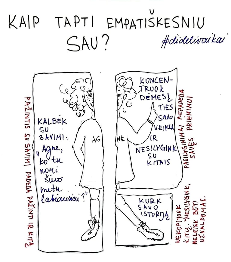 Mylėti save nereiškia būti egoistu. Mylėti save = pažinti save taip gerai, kad gebėtum atsitraukti ir nenudegti, kad gebėtum išbūti tik tiek, kiek reikia, pasisaugoti, pajausti grėsmę, apkabinti save, kai reikia paramos. Kol mes to nemokėsime su savimi, tol negebėsime jausti kito. Tuo pačiu ir savo vaiko (tiek vidinio, tiek šalia esančio).