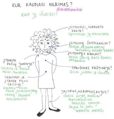 Raskite vietą, kad Jūsų ramybės niekas nedrumstų bent kokias penkias minutes. Užsimerkite. Pajauskite savo kaktos sritį. Kokia ji? Ar įsitempusi? Jei taip, pakilnokite antakius aukštyn ir žemyn, pirštais palieskite ir švelniai masažuokite, atpalaiduokite. Tuomet patikrinkite savo žandikaulio sritį. Atverkite burną, pastumdykite apatinį žandikaulį kairėn dešinėn kelis kartus, atpalaiduokite. Kaip jaučiasi Jūsų kaklas? Pasukiokite kalvą, atloškite ją pirmyn ir atgal, sukite ratu, atpalaiduokite. O pečių juosta? Pakelkite aukštyn žemyn pečius, sukite jais ratus, atpalaiduokite. Pajauskite savo kūtinės sritį. Kelis kartus giliai įkvėpkite ir iškvėpkite. Pridėkite ranką prie krūtinės, pasistenkite jausti savo kvėpavimą, širdies ritmą. Atsipalaiduokite. Ką veikia Jūsų pilvas? Nugaros apatinė juosta? Pabandykite kvėpuoti pilvu, išpūskite ir įtraukite kelis kartus pilvą. Pasukite įsivaizduojamą lanką aplink save. Atsipalaiduokite. Kaip kojos? Joms taip pat reikia pagalbos? Iškelkite kojas aukščiau, masažuokite (arba paprašykite, kad kas pamasažuotų). Ar pasijutote geriau? Nepamirškite peržvelgti savęs kasdien. Tai neleis kauptis nerimui Jūsų kūne ir suteiks daugiau jėgų kasdieniuose darbuose.