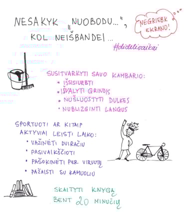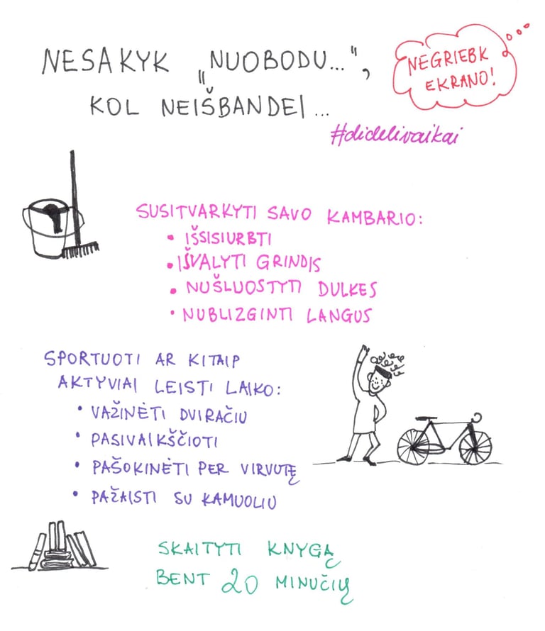 "Mama, man nuo-bo-du! Ką man veikti? Man nėra ką veikti!", - zirzulys vos atsikėlus, vos akis pramerkus. Ar pažįstama? Vasara tampa išbandymų metu, kai mokyklų ir būrelių durys užsiveria, o namai nuo ryto iki vakaro pilni nelaimingų ir nerandančių sau vietos vaikų. Kaip ir norėtųsi, kad kažkuo užsiimtų, nelindėtų ekranuose, bet kaip ir nieko jiems, vargšams, nėra, ką pasiūlyti... Vargšulyčiai... Tada mamos, tėčiai, seneliai ir senelės ima ieškoti linksminančių vaikus pramogų arba nuleidžia rankas ir pasiduoda ekranų galiai.
